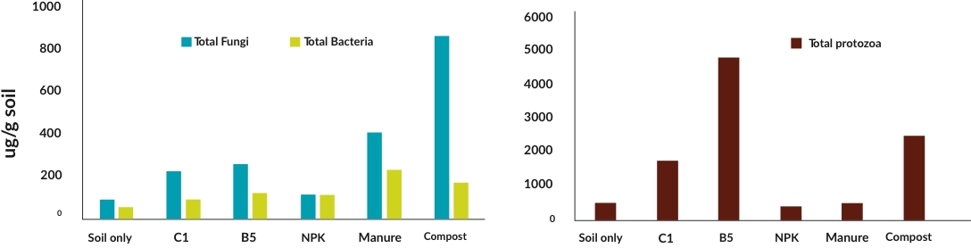 Improving and sustaining the size of soil microbial biomass through carbon input is important component of soil health and nutrient cycling. Preliminary results show the ABF treatments (C1 and B5) were able to increase the size of soil microbial biomass (bacteria, fungi and protozoa). Though this increase in bacteria and fungi biomasses was lower compared to that in the manure and compost (these materials inherently have large amounts of microbes) amended soils, the ABF products have the potential to build soil microbial biomass over time. The mass of total protozoa (flagellates, amoeba and ciliates) was higher in the ABF treatments. The activity and predation by protozoa on bacteria and fungi plays an important role in nutrient recycling and uptake by plant.