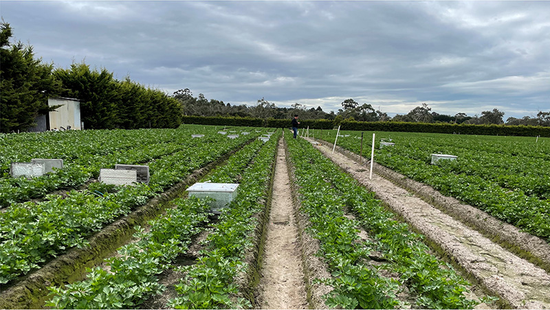 Field trial was established at a celery farm at Baxter, Victoria by Latrobe University. Treatments compared ABF products to standard farmer’s practice of using synthetic fertilisers and chicken manure. Treatment applications followed farmer’s practice of both pre- and post-plant fertilisaiton. Greenhouse gas emissions were measured from selected treatments using an automated chamber system.