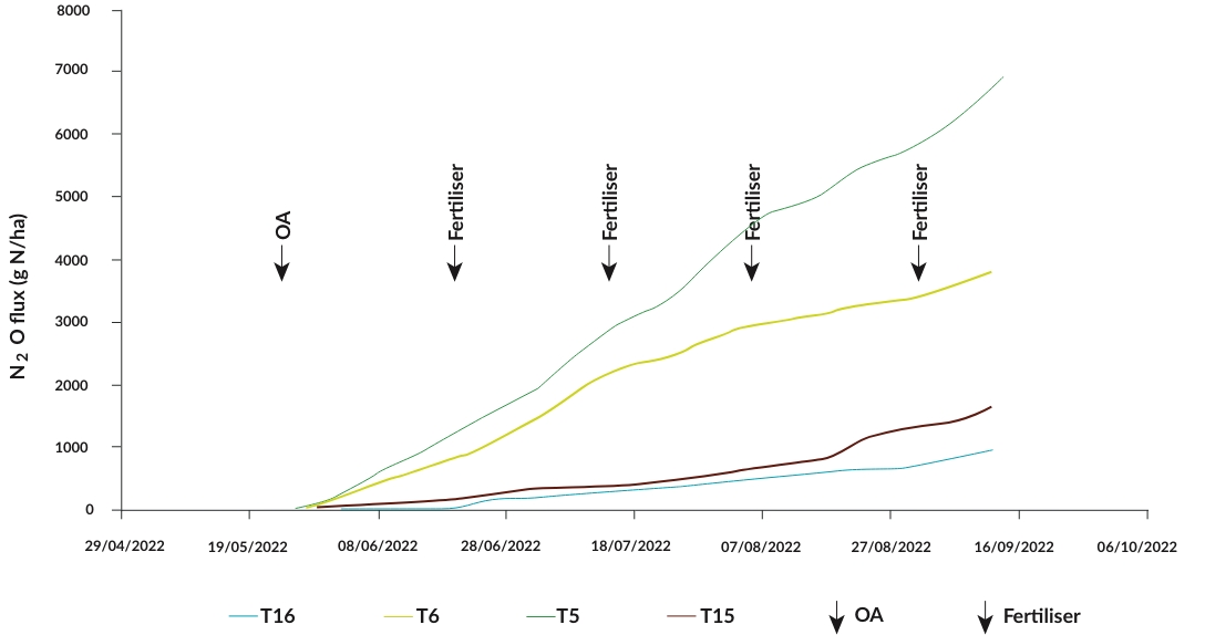 The ABF product used in this trial had lower N2O emission than the inorganic fertiliser and the manure + inorganic fertiliser. The total GHG (CO2-equivalent) emission from the ABF was lower than the manure + inorganic fertiliser (a common farming practice).