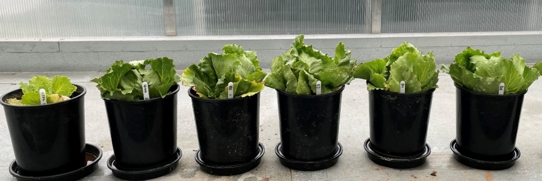 Lettuce. Left to right: Soil only, Urea, B5, B7, D1 and D5