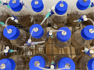 Photo: Incubation vials with fittings for greenhouse gas sampling for GC measurement. Graph: Cumulative nitrous oxide emission, over 22 days of incubation, from soil with different treatment applications.